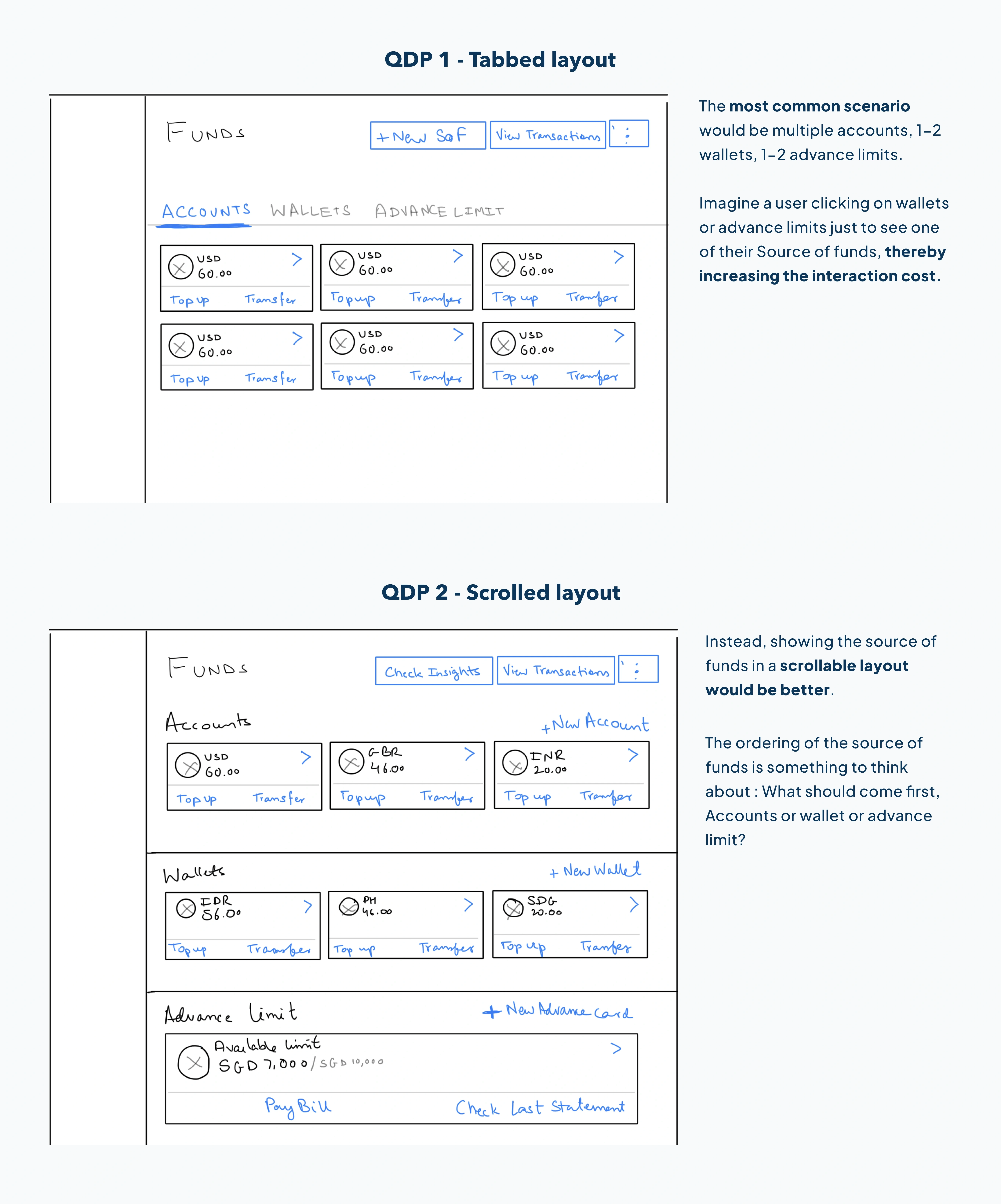 What I did : Once the requirements were clear, I started creating pen paper based UIs showing different versions of the funds page, so that I can share it with my design manager and get an early feedback.